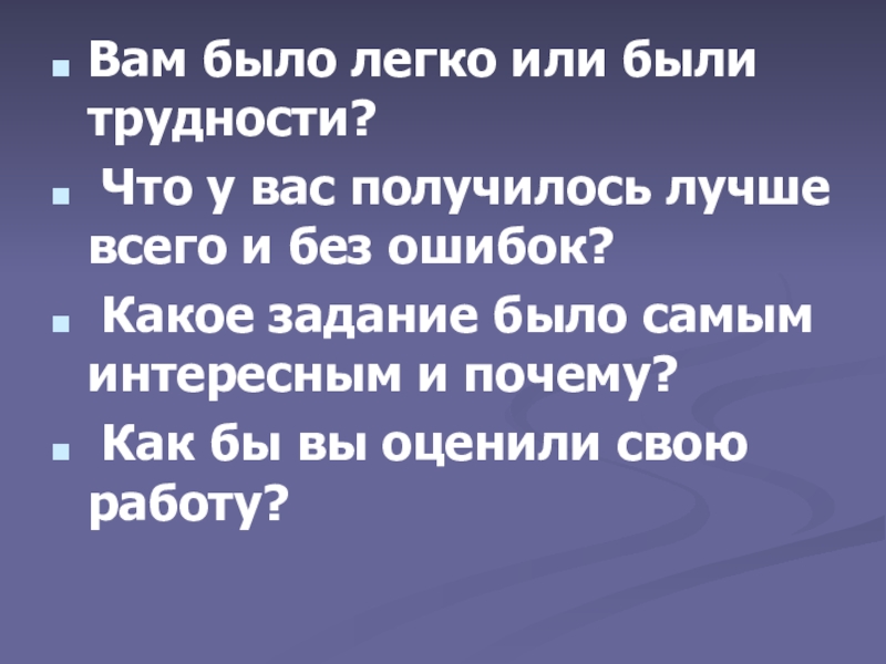 Вам было легко или были трудности? Что у вас получилось лучше всего и без ошибок? Какое задание