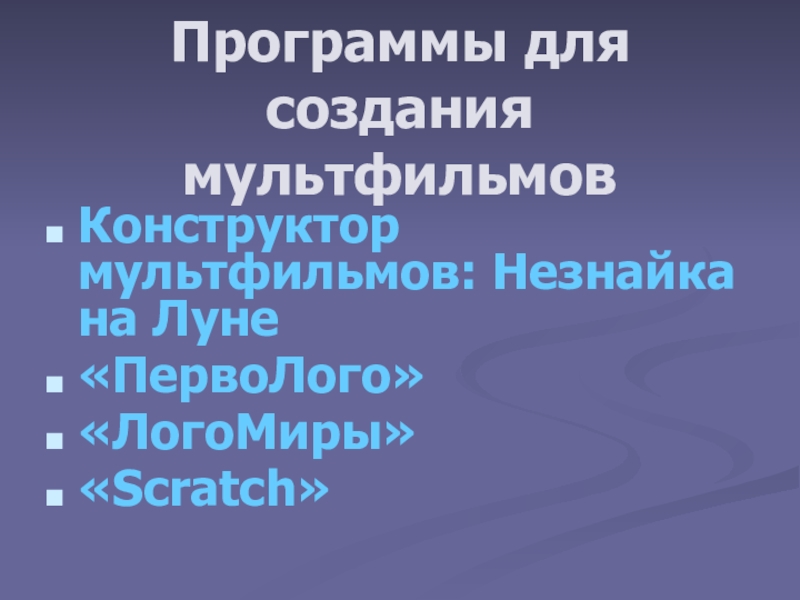Программы для создания мультфильмовКонструктор мультфильмов: Незнайка на Луне«ПервоЛого»«ЛогоМиры»«Scratch»