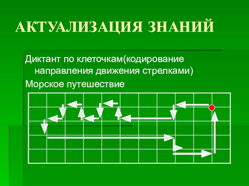 АКТУАЛИЗАЦИЯ ЗНАНИЙДиктант по клеточкам(кодирование направления движения стрелками)Морское путешествие