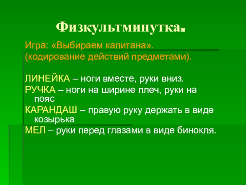 Физкультминутка.Игра: «Выбираем капитана».(кодирование действий предметами).ЛИНЕЙКА – ноги вместе, руки вниз.РУЧКА – ноги на ширине плеч, руки на