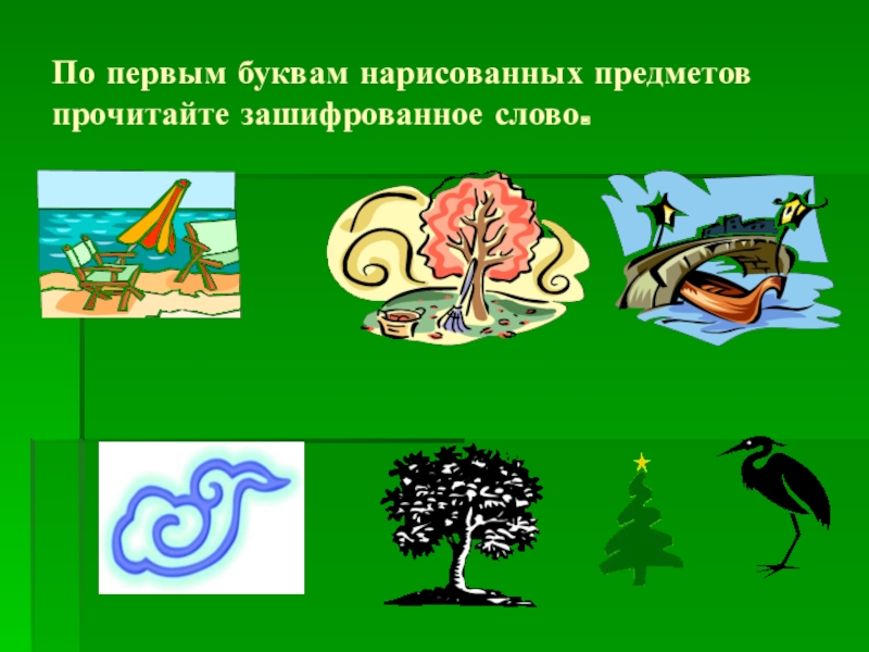 Слайд 15По первым буквам нарисованных предметов прочитайте зашифрованное слово.