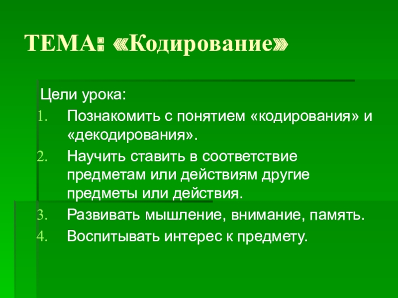 ТЕМА: «Кодирование»Цели урока: Познакомить с понятием «кодирования» и «декодирования».Научить ставить в соответствие предметам или действиям другие предметы или действия.Развивать мышление, внимание, память.Воспитывать интерес к предмету.