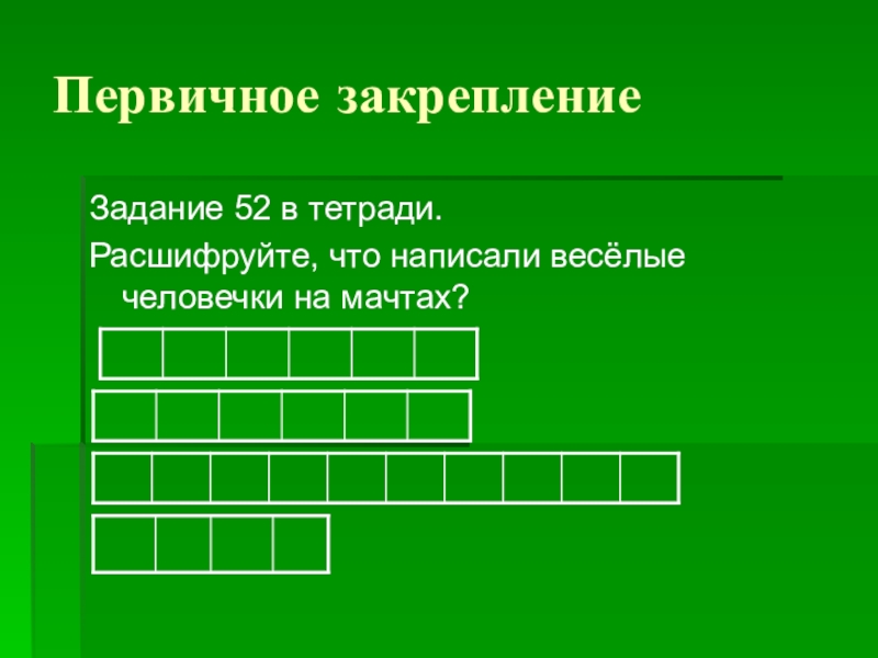 Первичное закреплениеЗадание 52 в тетради. Расшифруйте, что написали весёлые человечки на мачтах?