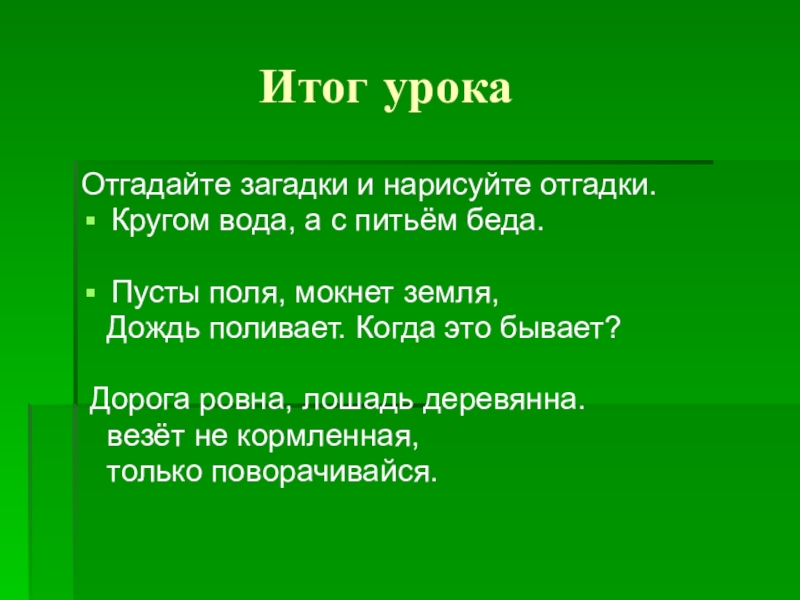Итог урокаОтгадайте загадки и нарисуйте отгадки.Кругом вода, а с питьём