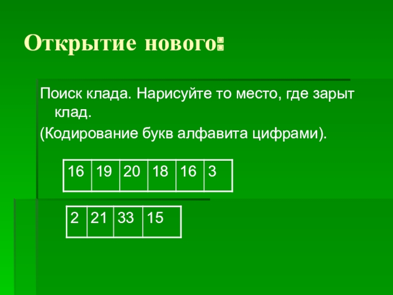 Открытие нового:Поиск клада. Нарисуйте то место, где зарыт клад.(Кодирование букв алфавита цифрами).