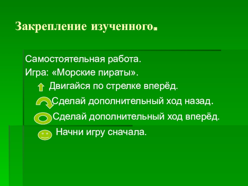 Закрепление изученного.Самостоятельная работа.Игра: «Морские пираты».     Двигайся по стрелке вперёд.