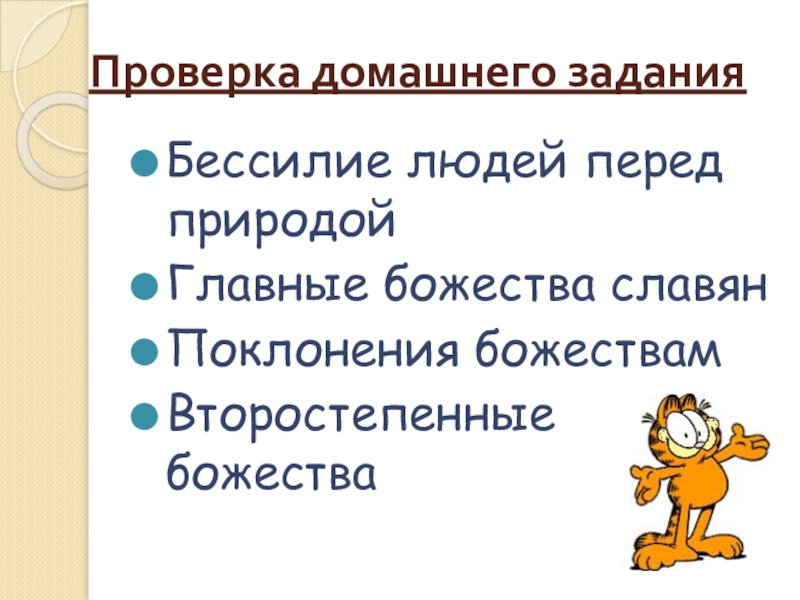 Проверка домашнего заданияБессилие людей перед природойГлавные божества славянПоклонения божествамВторостепенные божества