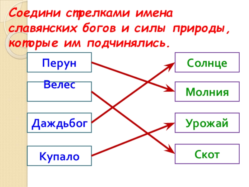 Соедини стрелками имена славянских богов и силы природы, которые им подчинялись.ПерунВелесДаждьбогКупалоСкотУрожайМолнияСолнце