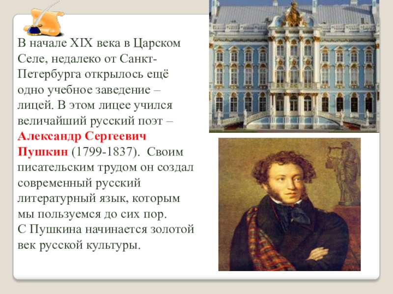 ещё одно учебное заведение – лицей. В этом лицее учился величайший русский поэт – Александр Сергеевич Пушкин (1799-1837). Своим писательским трудом он создал современный русский литературный язык, которым мы пользуемся до сих пор.