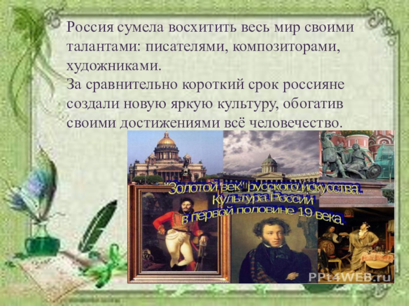 короткий срок россияне создали новую яркую культуру, обогатив своими достижениями всё человечество.