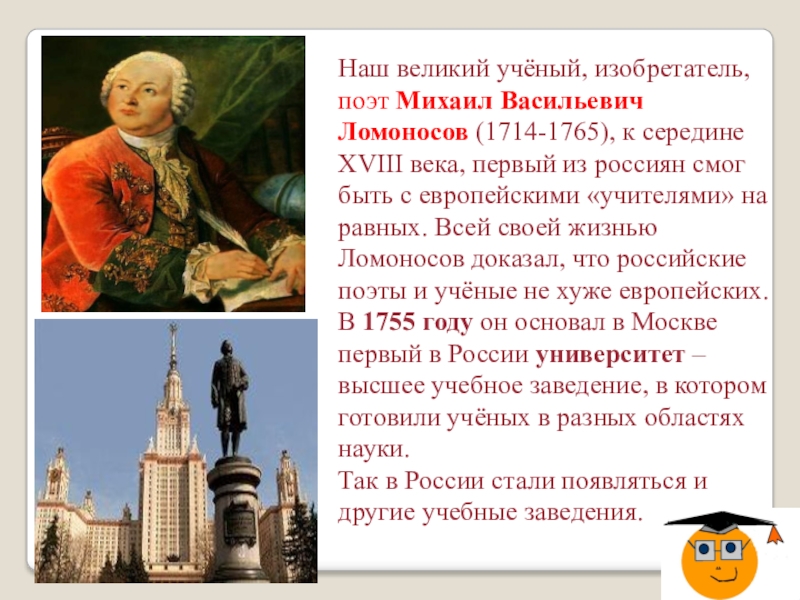 В 1755 году он основал в Москве первый в России университет – высшее учебное заведение, в котором готовили учёных в разных областях науки.