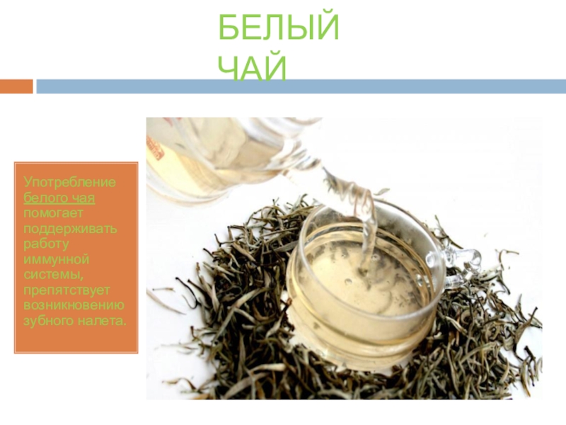 БЕЛЫЙ ЧАЙУпотребление белого чая помогает поддерживать работу иммунной системы, препятствует возникновению зубного налета.