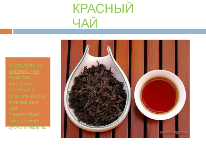 КРАСНЫЙ ЧАЙУпотребление красного чая помогает успешнее бороться с лишним весом. А также этот чай препятствует накоплению зубного