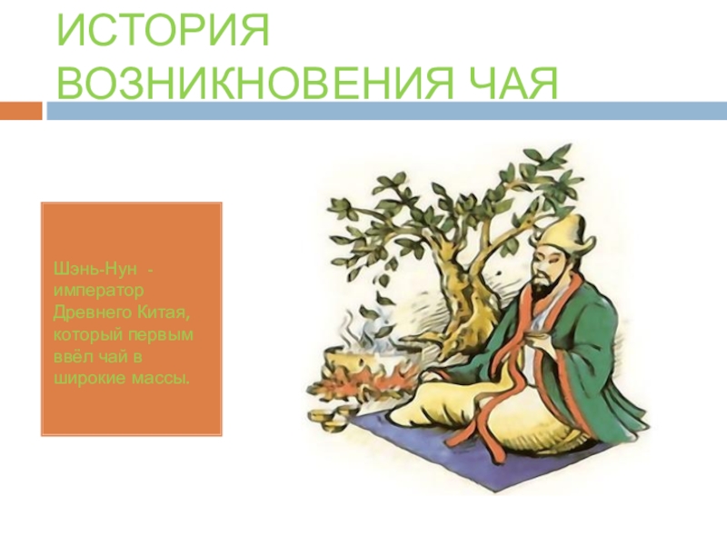 ИСТОРИЯ ВОЗНИКНОВЕНИЯ ЧАЯШэнь-Нун - император Древнего Китая, который первым ввёл чай в широкие массы.