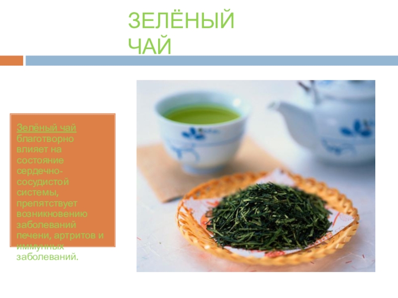 ЗЕЛЁНЫЙ ЧАЙЗелёный чай благотворно влияет на состояние сердечно-сосудистой системы, препятствует возникновению заболеваний печени, артритов и иммунных заболеваний.