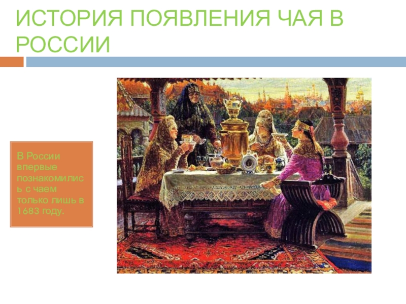 ИСТОРИЯ ПОЯВЛЕНИЯ ЧАЯ В РОССИИВ России впервые познакомились с чаем только лишь в 1683 году.