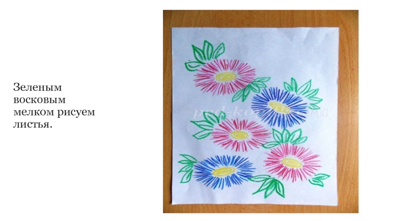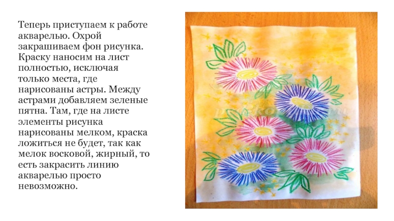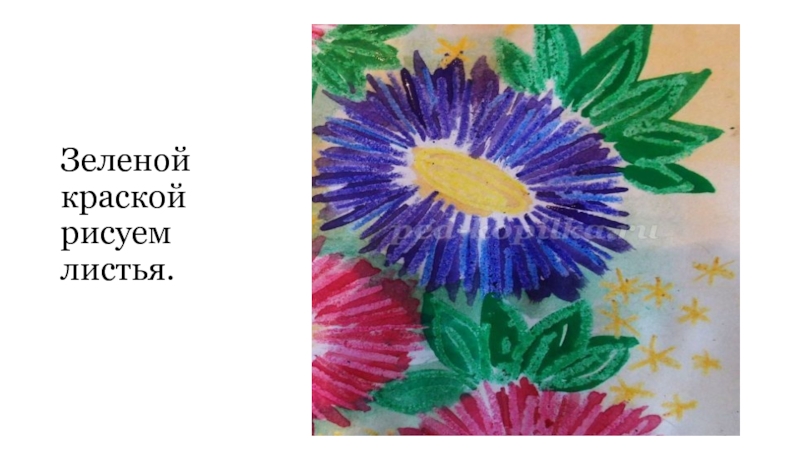 на лист полностью, исключая только места, где нарисованы астры. Между астрами добавляем зеленые пятна. Там, где на листе элементы рисунка нарисованы мелком, краска ложиться не будет, так как мелок восковой, жирный, то есть закрасить линию акварелью просто невозможно.
