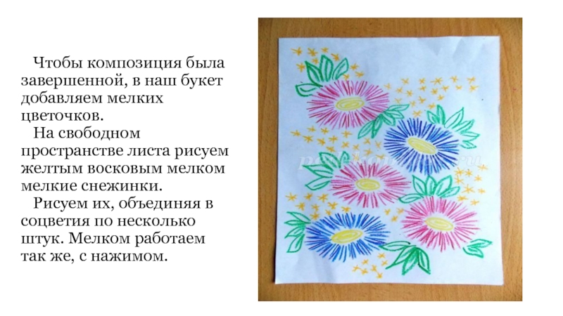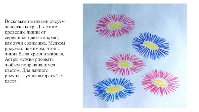 цветка к краю, как лучи солнышка. Мелком рисуем с нажимом, чтобы линия была яркая и жирная. Астры можно рисовать любым понравившимся цветом. Для данного рисунка лучше выбрать 2-3 цвета.
