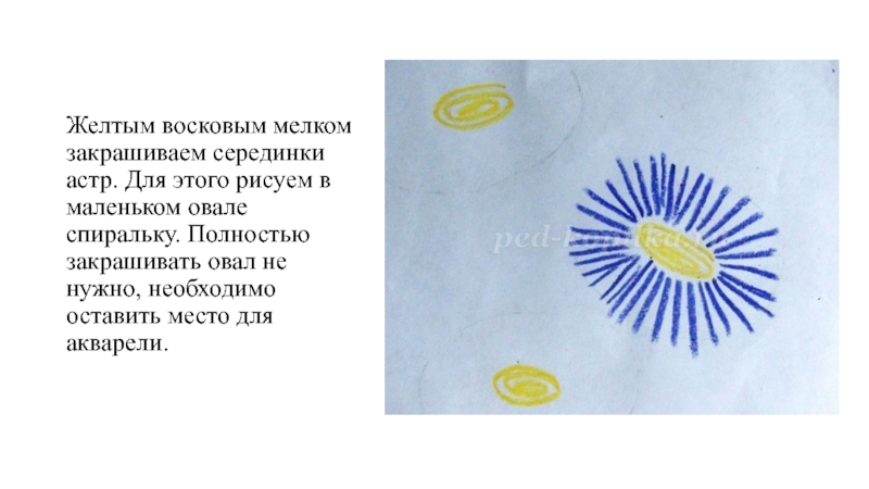 Слайд 4Желтым восковым мелком закрашиваем серединки астр. Для этого рисуем в маленьком