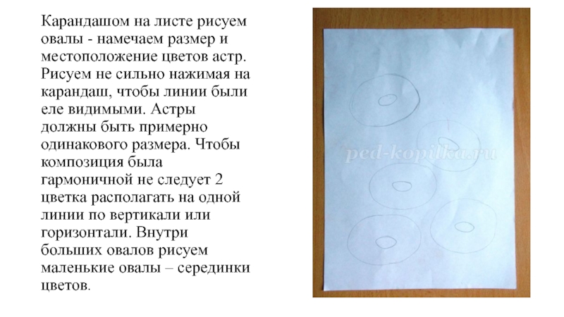 Карандашом на листе рисуем овалы - намечаем размер и местоположение цветов астр. Рисуем не сильно нажимая на