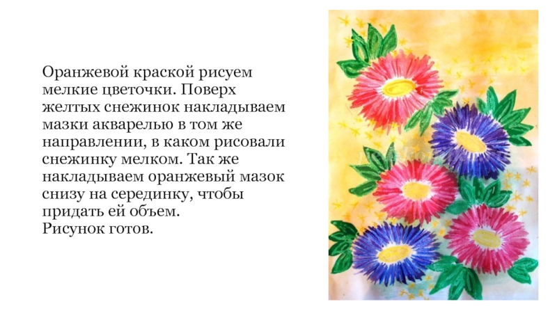 Слайд 11Оранжевой краской рисуем мелкие цветочки. Поверх желтых снежинок накладываем мазки акварелью