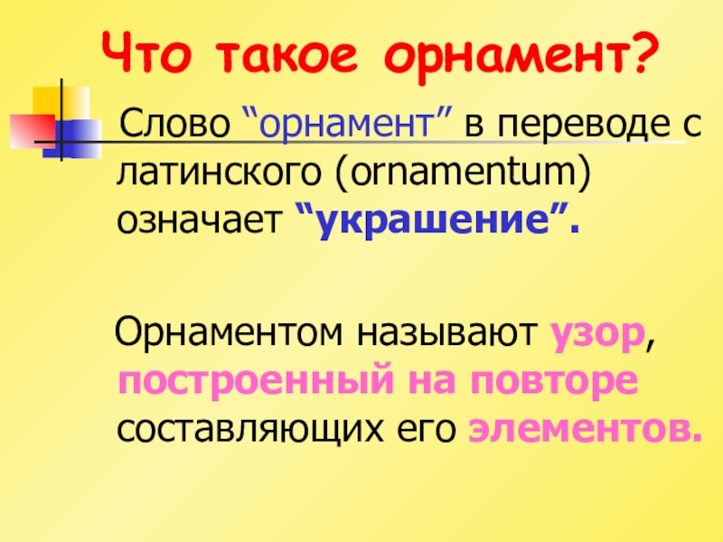 Что такое орнамент?  Слово “орнамент” в переводе с латинского (ornamentum) означает “украшение”.  Орнаментом называют узор,