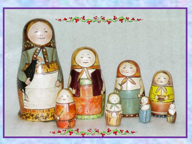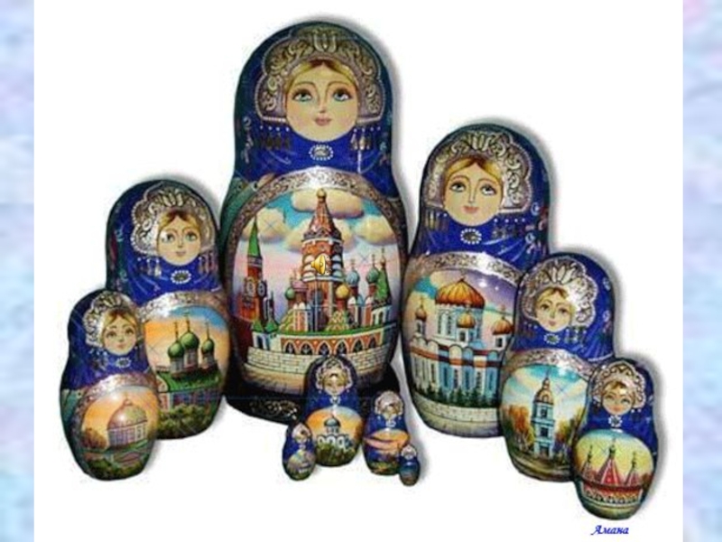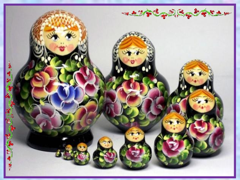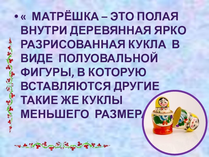 « МАТРЁШКА – ЭТО ПОЛАЯ ВНУТРИ ДЕРЕВЯННАЯ ЯРКО РАЗРИСОВАННАЯ КУКЛА В ВИДЕ ПОЛУОВАЛЬНОЙ ФИГУРЫ, В КОТОРУЮ ВСТАВЛЯЮТСЯ