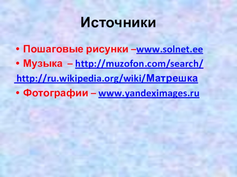 ИсточникиПошаговые рисунки –www.solnet.eeМузыка – http://muzofon.com/search/ http://ru.wikipedia.org/wiki/МатрешкаФотографии – www.yandeximages.ru