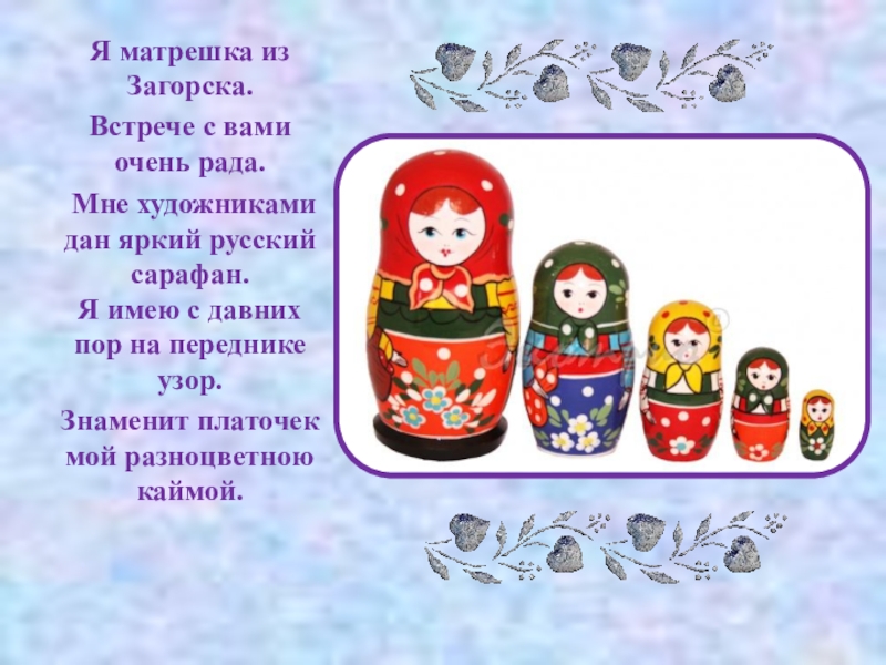 Я матрешка из Загорска. Встрече с вами очень рада. Мне художниками дан яркий русский сарафан. Я имею