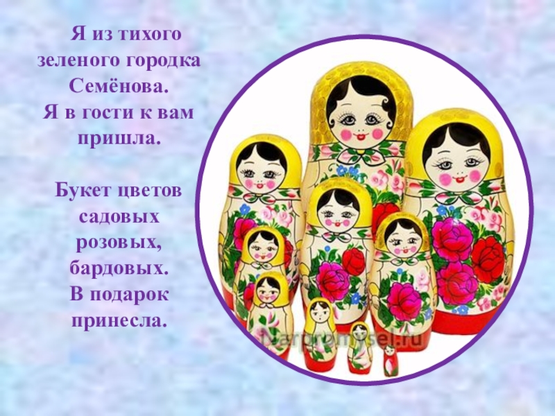 Я из тихого зеленого городка Семёнова. Я в гости к вам пришла.