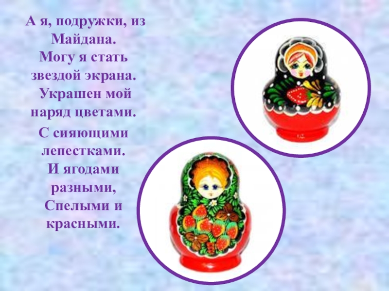 А я, подружки, из Майдана. Могу я стать звездой экрана.  Украшен мой наряд цветами.С сияющими лепестками.