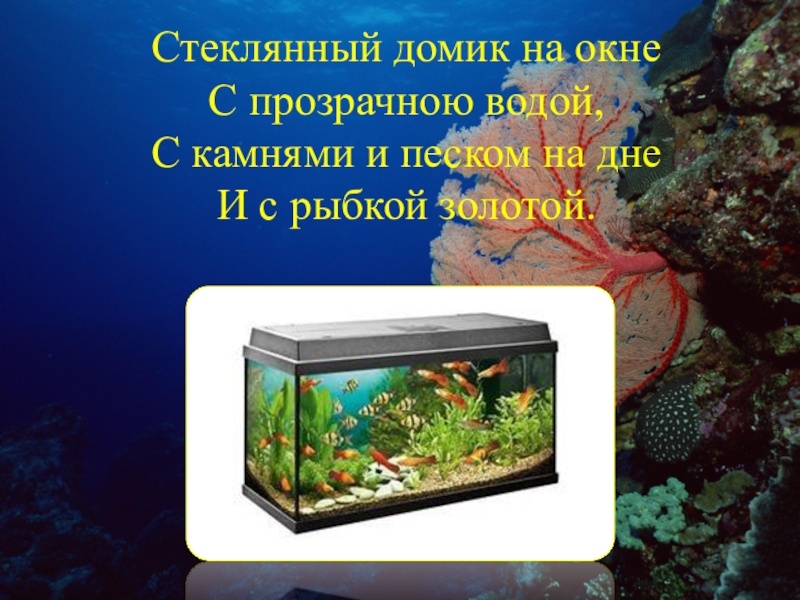 Слайд 4Стеклянный домик на окне  С прозрачною водой,  С камнями и песком на дне  И