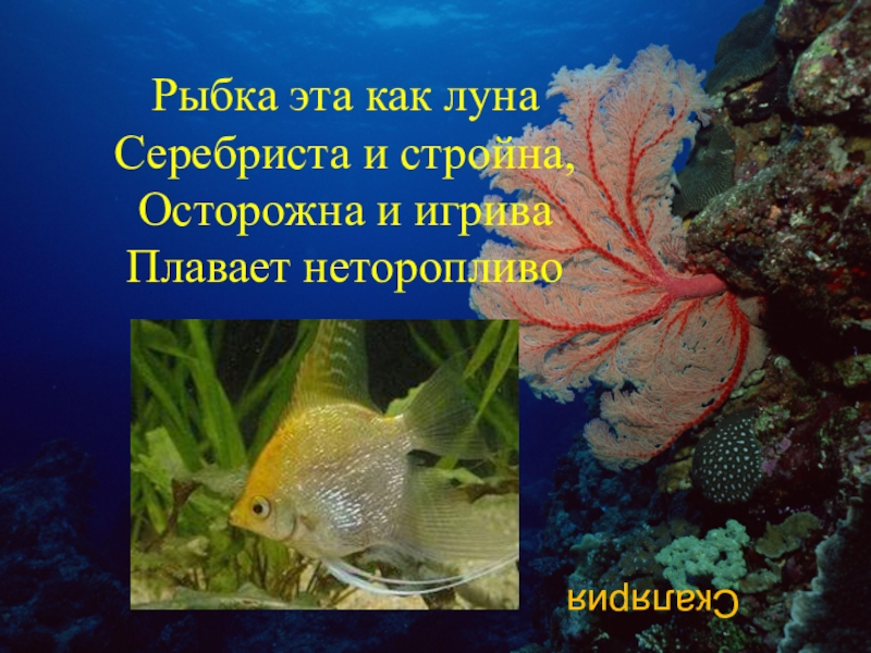 Рыбка эта как луна Серебриста и стройна, Осторожна и игрива Плавает неторопливоСкалярия