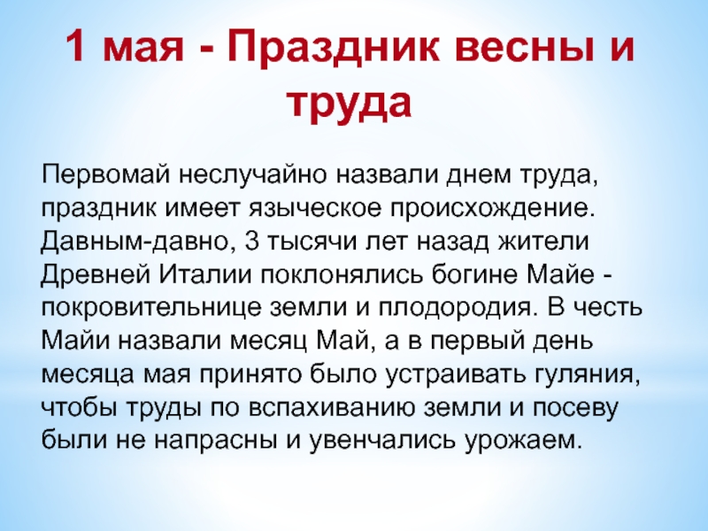 Давным-давно, 3 тысячи лет назад жители Древней Италии поклонялись богине Майе - покровительнице земли и плодородия. В честь Майи назвали месяц Май, а в первый день месяца мая принято было устраивать гуляния, чтобы труды по вспахиванию земли и посеву были не напрасны и увенчались урожаем.