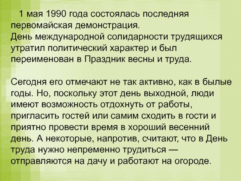 международной солидарности трудящихся утратил политический характер и был переименован в Праздник весны и труда.