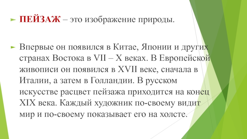и других странах Востока в VII – X веках. В Европейской живописи он появился в XVII веке, сначала в Италии, а затем в Голландии. В русском искусстве расцвет пейзажа приходится на конец XIX века. Каждый художник по-своему видит мир и по-своему показывает его на холсте.