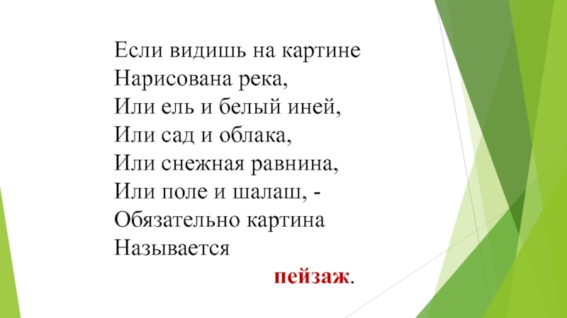 Если видишь на картинеНарисована река,Или ель и белый иней,Или сад и облака,Или снежная равнина,Или поле и шалаш, -Обязательно картинаНазывается