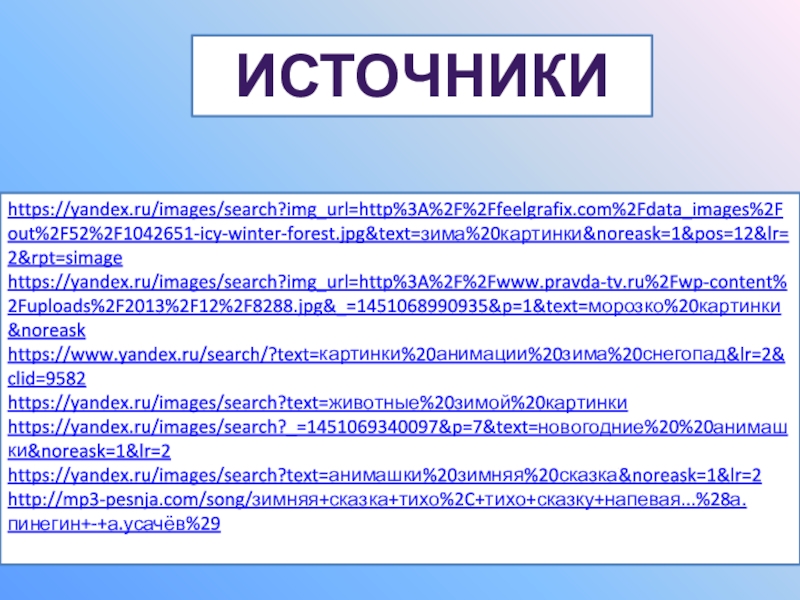 https://yandex.ru/images/search?img_url=http%3A%2F%2Ffeelgrafix.com%2Fdata_images%2Fout%2F52%2F1042651-icy-winter-forest.jpg&text=зима%20картинки&noreask=1&pos=12&lr=2&rpt=simagehttps://yandex.ru/images/search?img_url=http%3A%2F%2Fwww.pravda-tv.ru%2Fwp-content%2Fuploads%2F2013%2F12%2F8288.jpg&_=1451068990935&p=1&text=морозко%20картинки&noreaskhttps://www.yandex.ru/search/?text=картинки%20анимации%20зима%20снегопад&lr=2&clid=9582https://yandex.ru/images/search?text=животные%20зимой%20картинкиhttps://yandex.ru/images/search?_=1451069340097&p=7&text=новогодние%20%20анимашки&noreask=1&lr=2https://yandex.ru/images/search?text=анимашки%20зимняя%20сказка&noreask=1&lr=2http://mp3-pesnja.com/song/зимняя+сказка+тихо%2C+тихо+сказку+напевая...%28а.пинегин+-+а.усачёв%29Источники