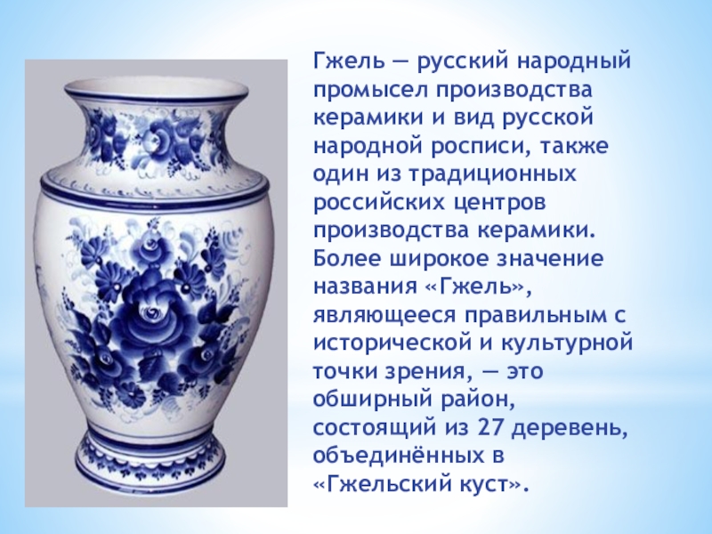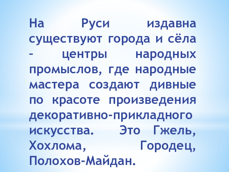 где народные мастера создают дивные по красоте произведения декоративно-прикладного искусства. Это Гжель, Хохлома, Городец, Полохов-Майдан.