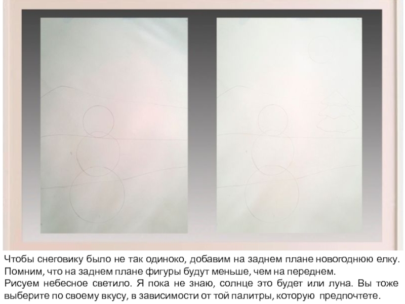 равнины. На переднем плане раскладываем три круглых предмета от большого к меньшему или наоборот, имитируя фигуру снеговика. Напоминаю, что нельзя рисовать, начиная от краев листа, лучше отступить 2-3 см.