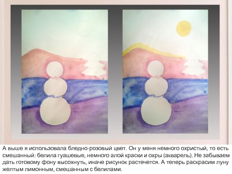 то есть смешанный: белила гуашевые, немного алой краски и охры (акварель). Не забываем дать готовому фону высохнуть, иначе рисунок растечется. А теперь раскрасим луну желтым лимонным, смешанным с белилами.