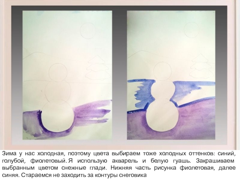 голубой, фиолетовый. Я использую акварель и белую гуашь. Закрашиваем выбранным цветом снежные глади. Нижняя часть рисунка фиолетовая, далее синяя. Стараемся не заходить за контуры снеговика