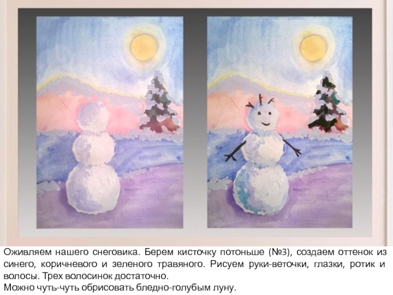 Слайд 10Оживляем нашего снеговика. Берем кисточку потоньше (№3), создаем оттенок из синего,