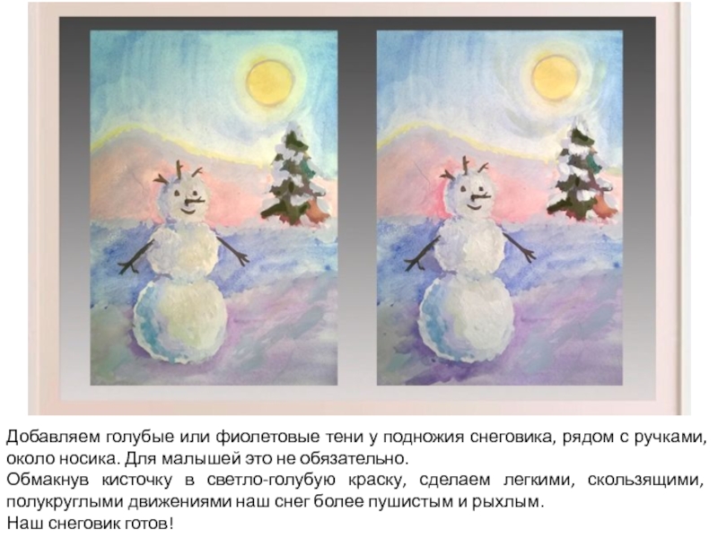 Слайд 11Добавляем голубые или фиолетовые тени у подножия снеговика, рядом с ручками,
