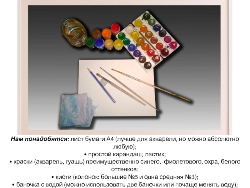 Слайд 2Нам понадобятся: лист бумаги А4 (лучше для акварели, но можно абсолютно