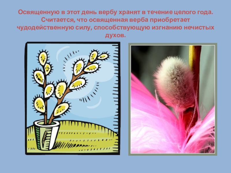 Слайд 6Освященную в этот день вербу хранят в течение целого года. Считается, что освященная верба