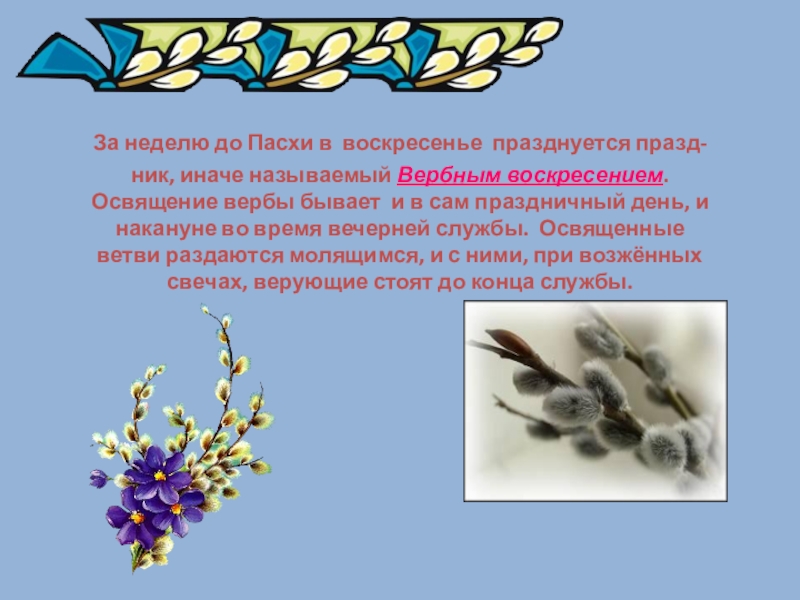 За неделю до Пасхи в воскресенье празднуется празд- ник, иначе называемый Вербным воскресением.