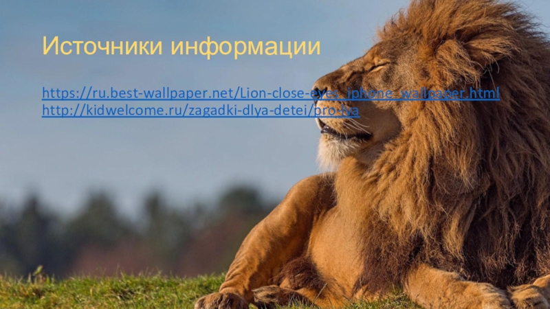 Источники информацииhttps://ru.best-wallpaper.net/Lion-close-eyes_iphone_wallpaper.html http://kidwelcome.ru/zagadki-dlya-detei/pro-lva