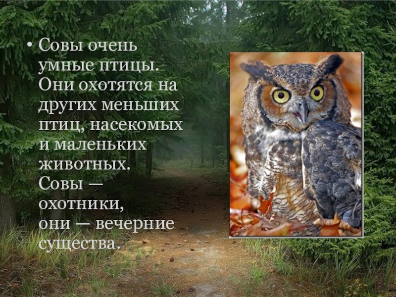 Слайд 3Совы очень умные птицы. Они охотятся на других меньших птиц, насекомых