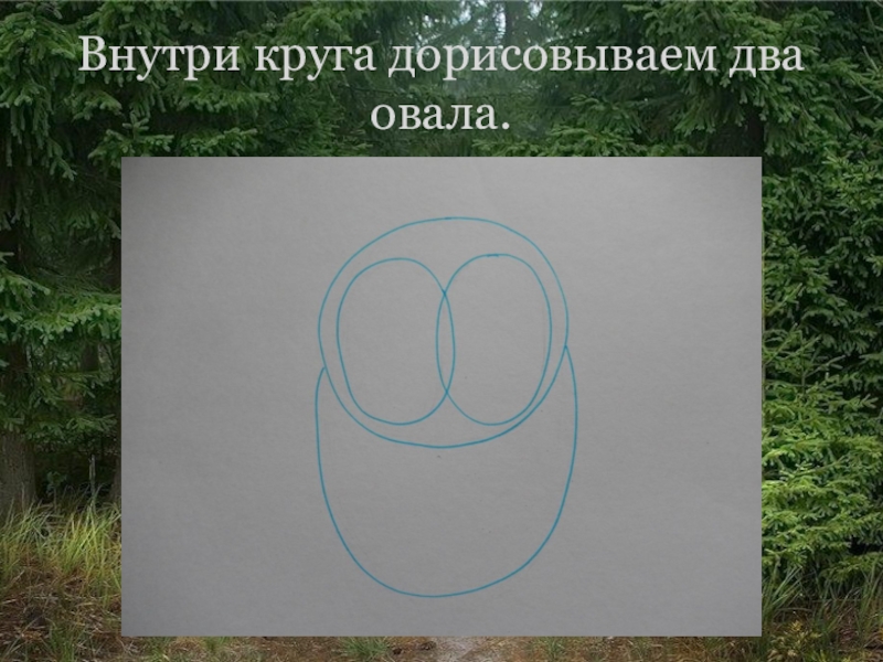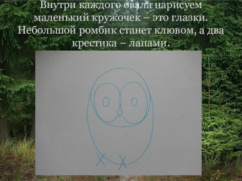 Слайд 7Внутри каждого овала нарисуем маленький кружочек – это глазки. Небольшой ромбик